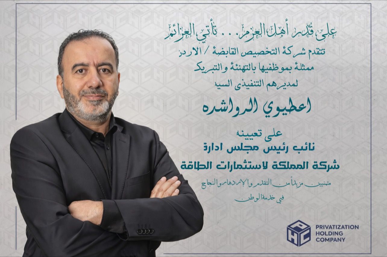 على قدر أهل العزم... تأتي العزائم تتقدم شركة التخصيص القابضة / الأردن ممثلة بموظفيها بالتهنئة والتبريك لمديرهم التنفيذ...